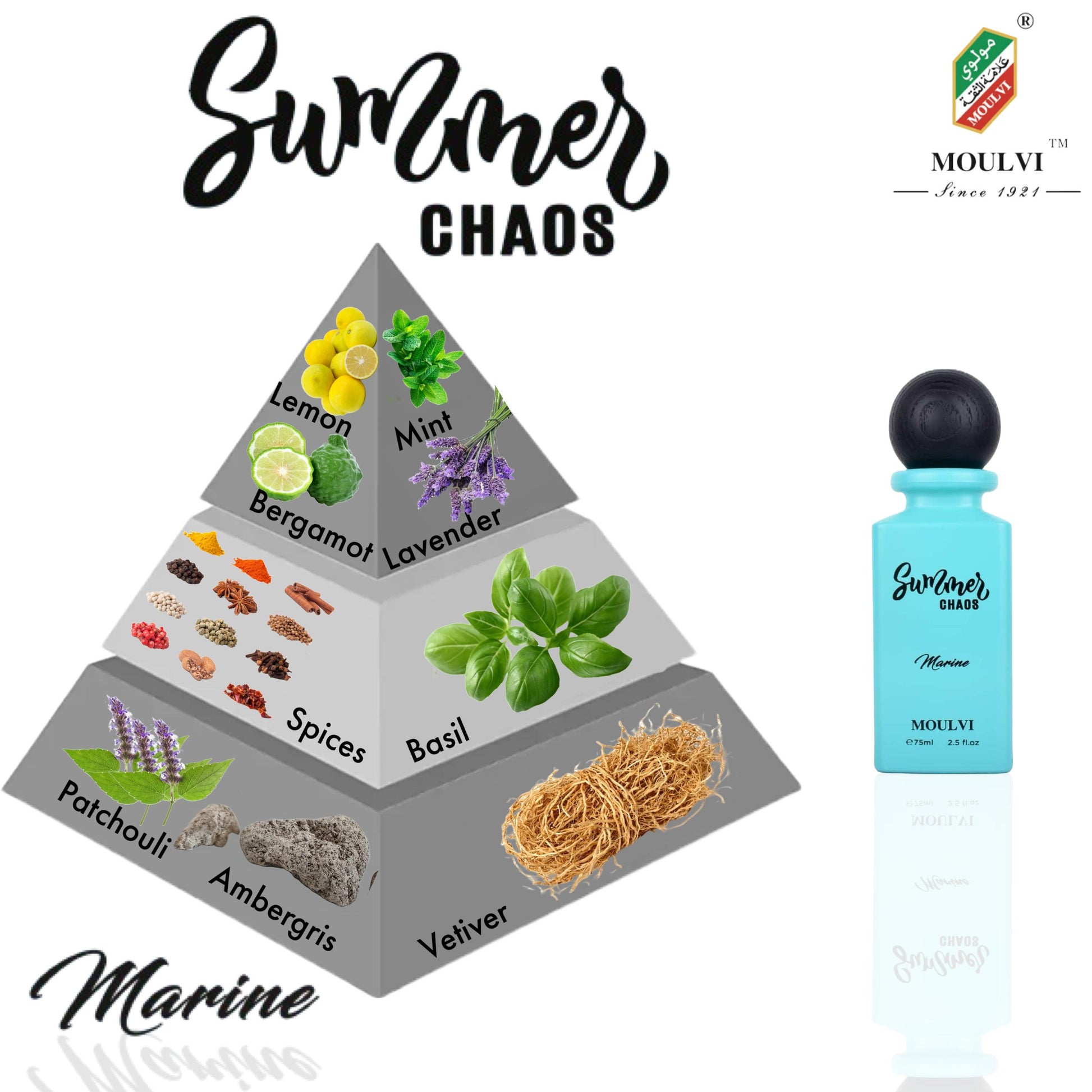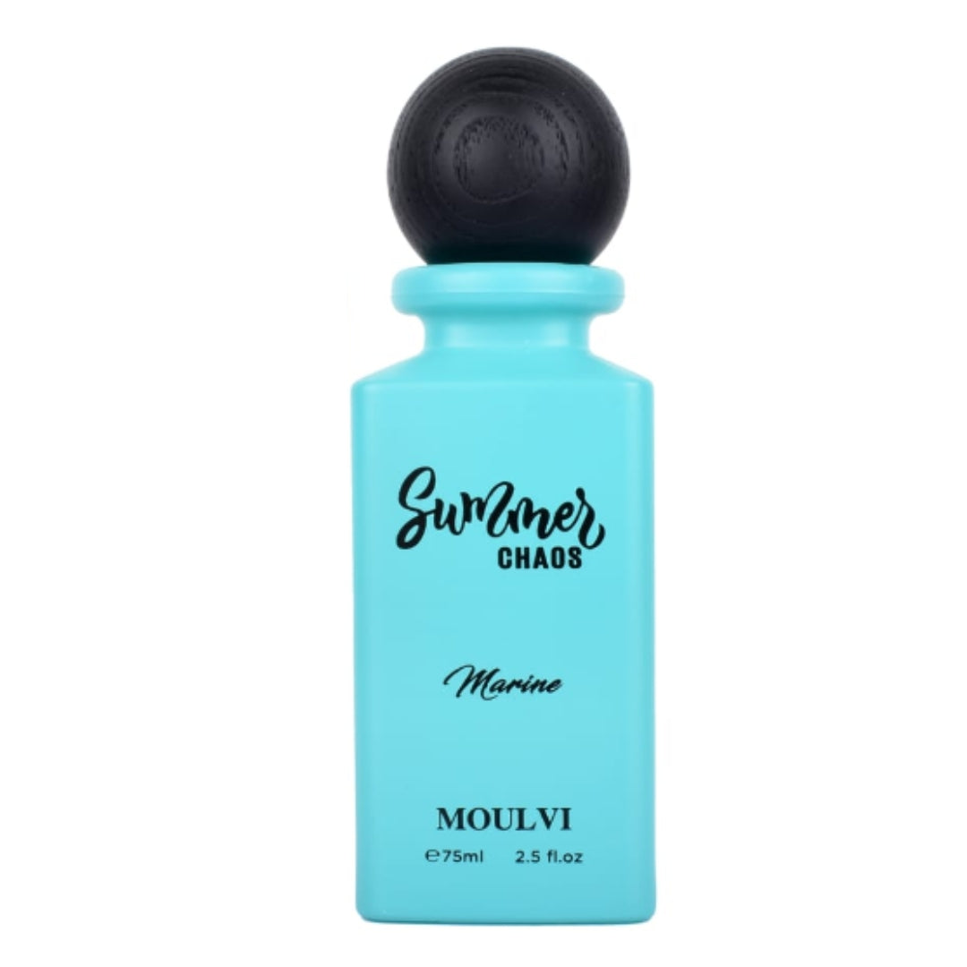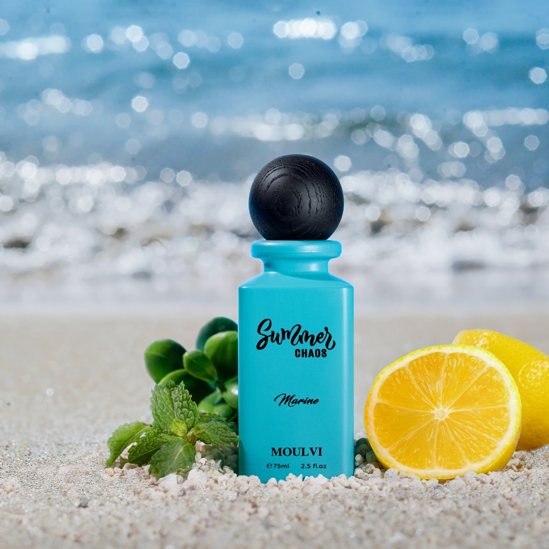 SUMMER CHAOS MARINE features fresh notes of lemon, mint, and lavender, followed by spices and basil in the second layer, with patchouli and ambergris in the third.